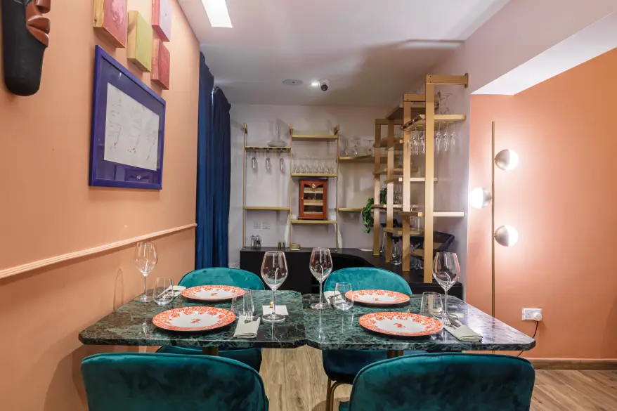 Tucked away at the back, The Wine Room is our private dining escape—warm, intimate, and humming with upscale African energy. For dinners that deserve mood, music, and just the right pour.